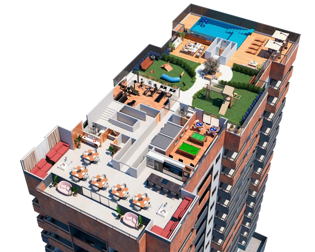 Uma junção mais que perfeita para quem busca por sofisticação, localização e privilégio de ter áreas de lazer na cobertura.